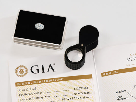 GIA experts grade diamond colour by comparing stones to master stones of known color under controlled lighting on white paper. This process ensures precise and accurate colour description on the D-Z scale. The colour grade is then included in the diamond's certified grading report alongside other characteristics.
