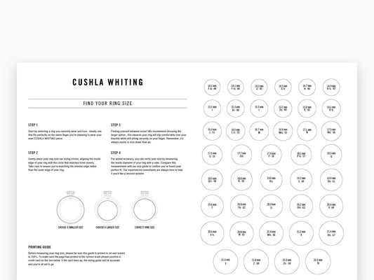 Welcome to CUSHLA WHITING's ring sizing guide, where we help you find the perfect fit for your dream ring. Whether you're planning a surprise proposal, treating yourself, or shopping for a loved one, we understand the importance of not just a beautiful design, but also a comfortable fit.