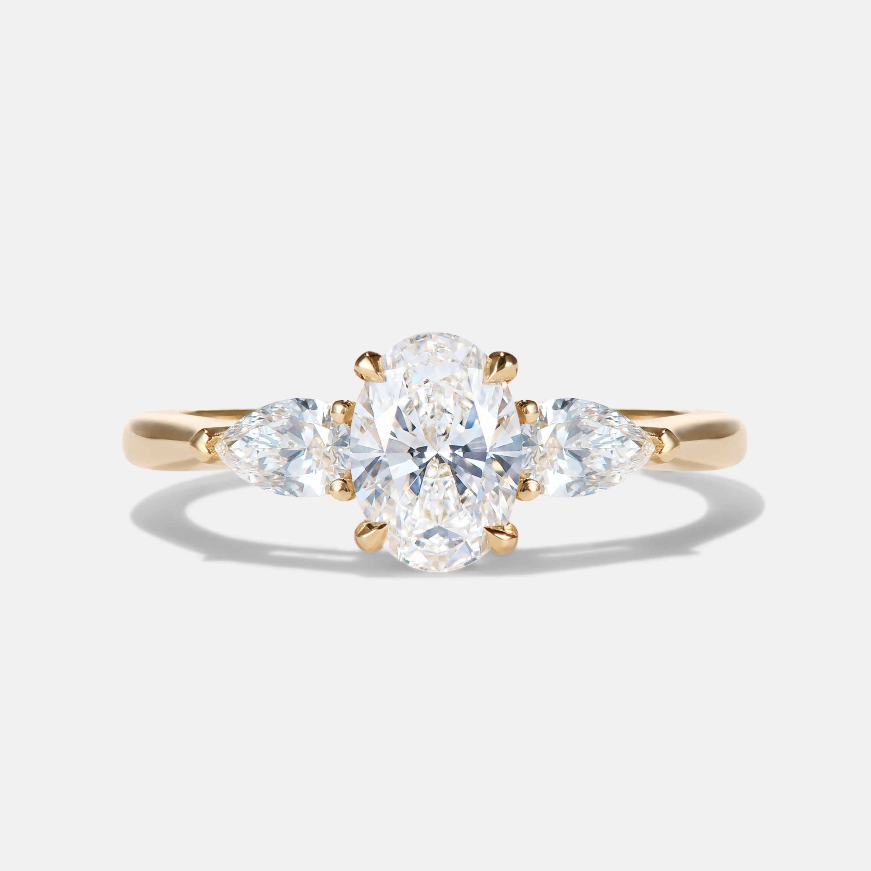 Starting from price is based on a 0.50 carat, D-F colour, VS-SI1 clarity oval centre diamond and a pair of 0.28ctw pear shaped diamonds on an 18 karat yellow gold band.