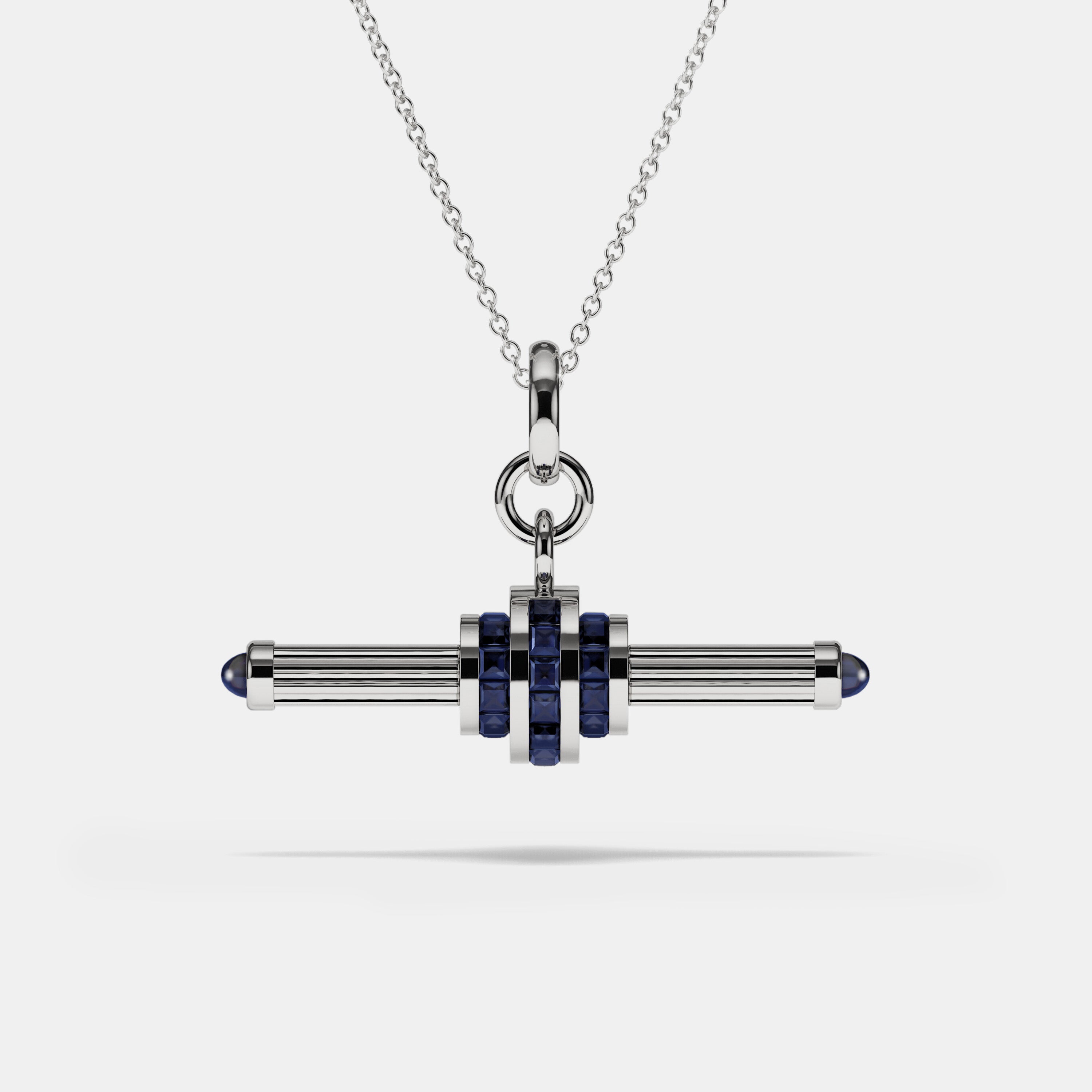 A channel-set T-BAR PENDANT with thirty-three 1.01ctw Square Step Cut dark blue sapphires and two 0.25ctw Cabochon Cut sapphires, set in 18 karat white gold.