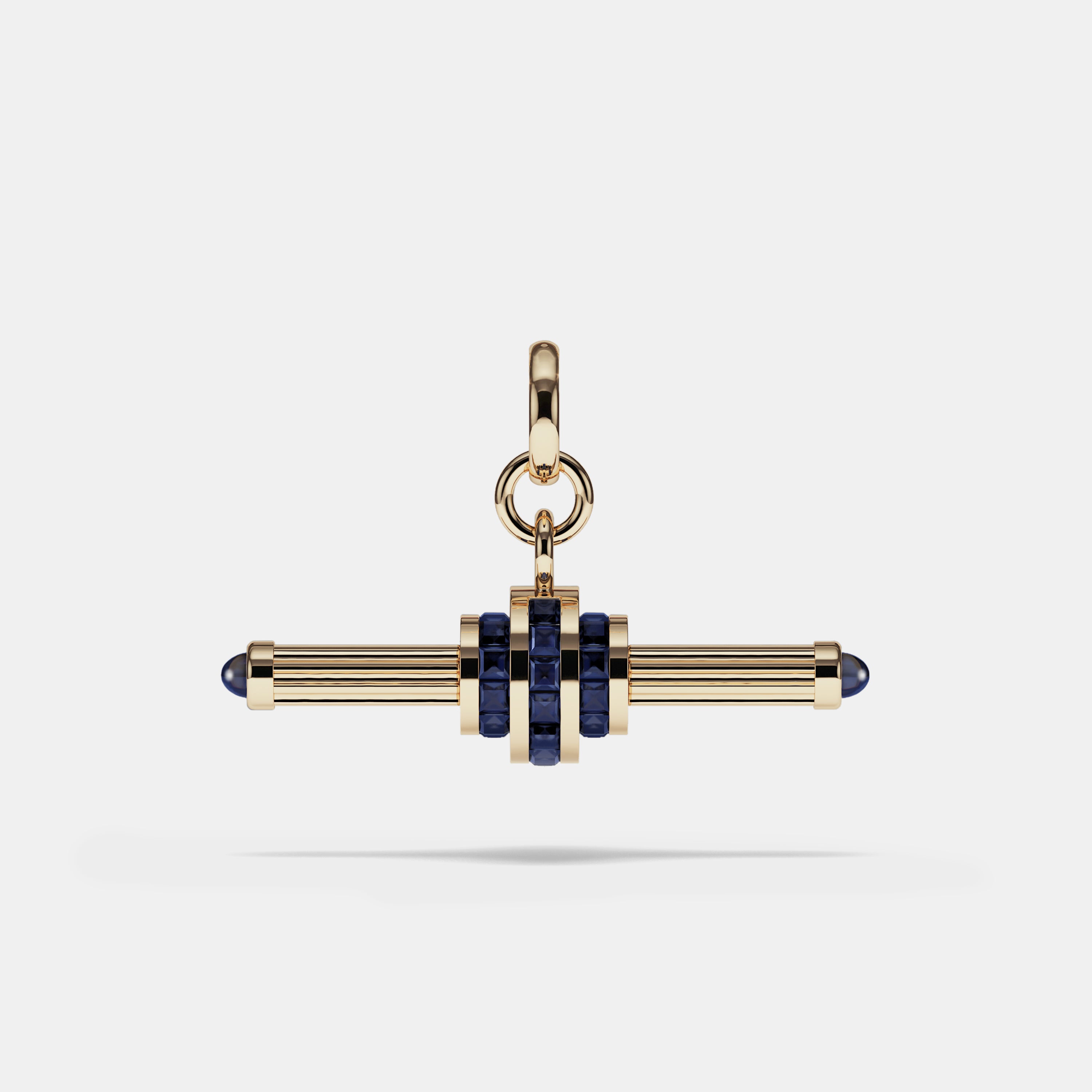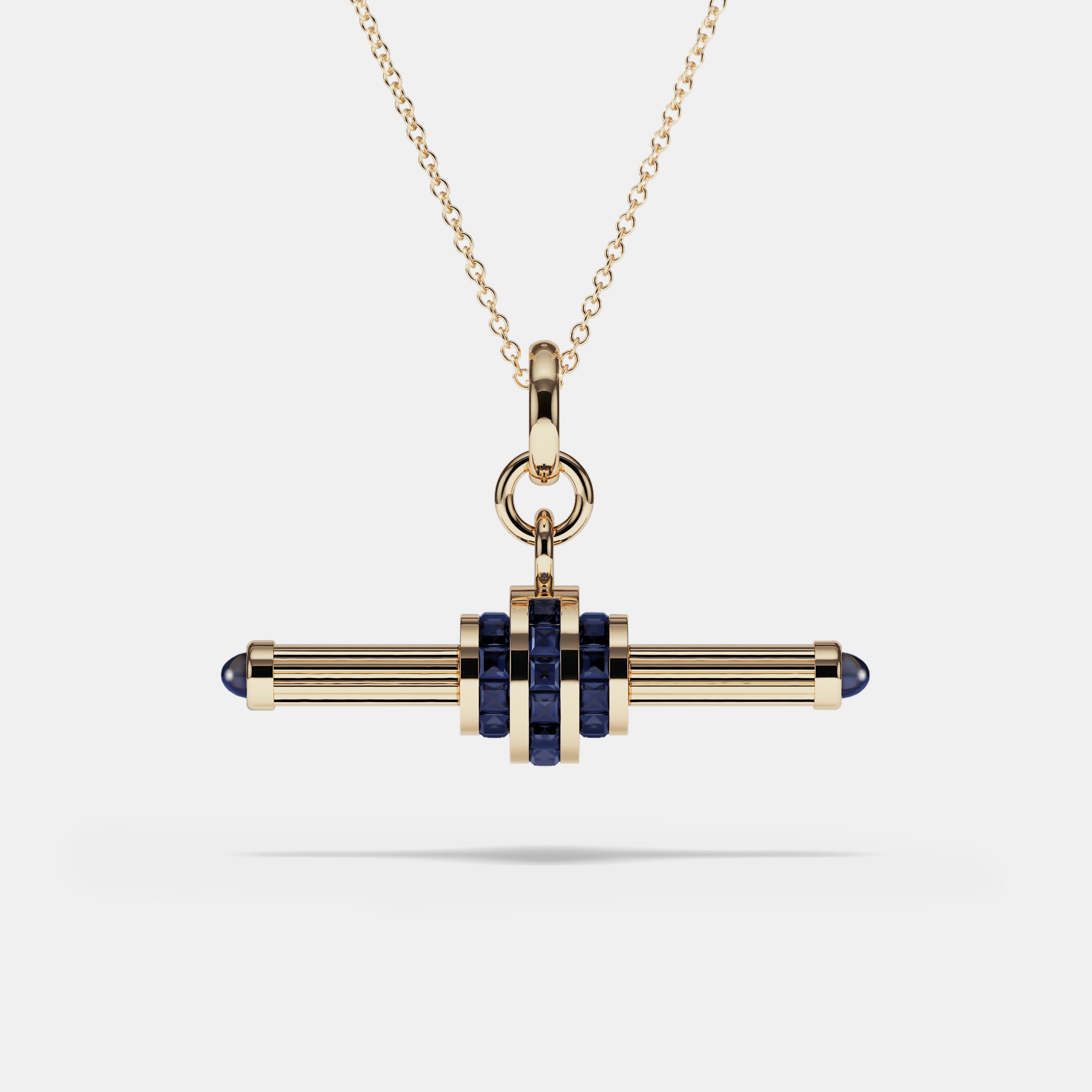 A channel-set T-BAR PENDANT with thirty-three 1.01ctw Square Step Cut dark blue sapphires and two 0.25ctw Cabochon Cut sapphires, set in 18 karat yellow gold.