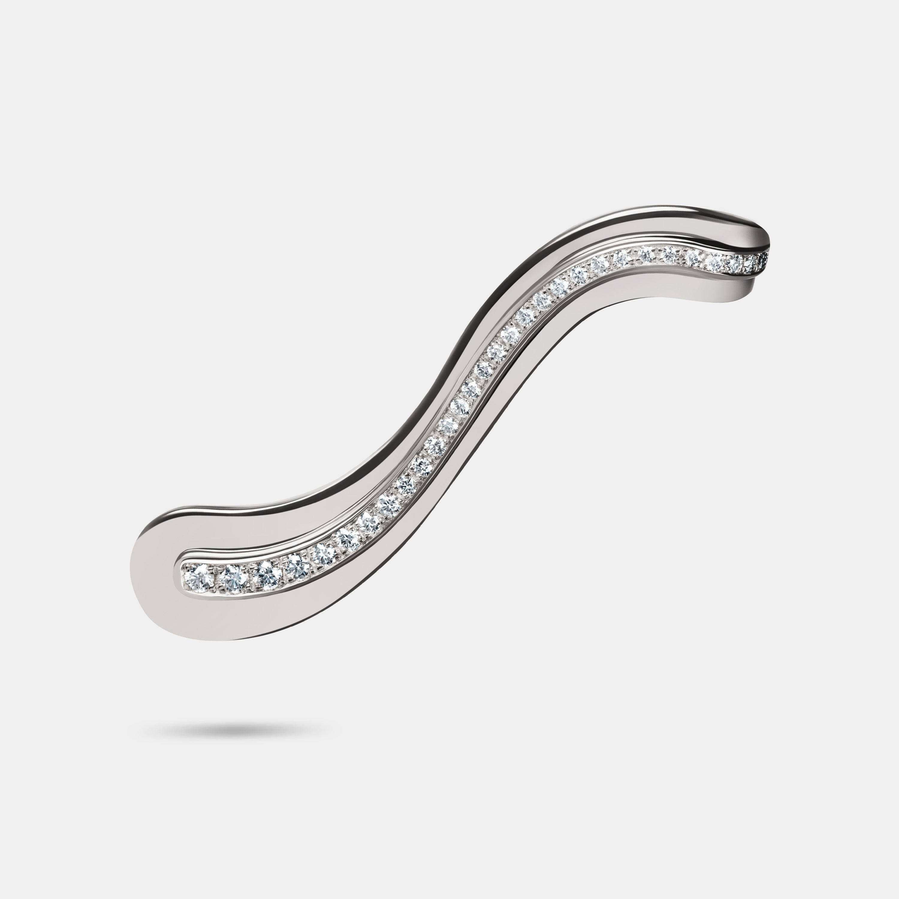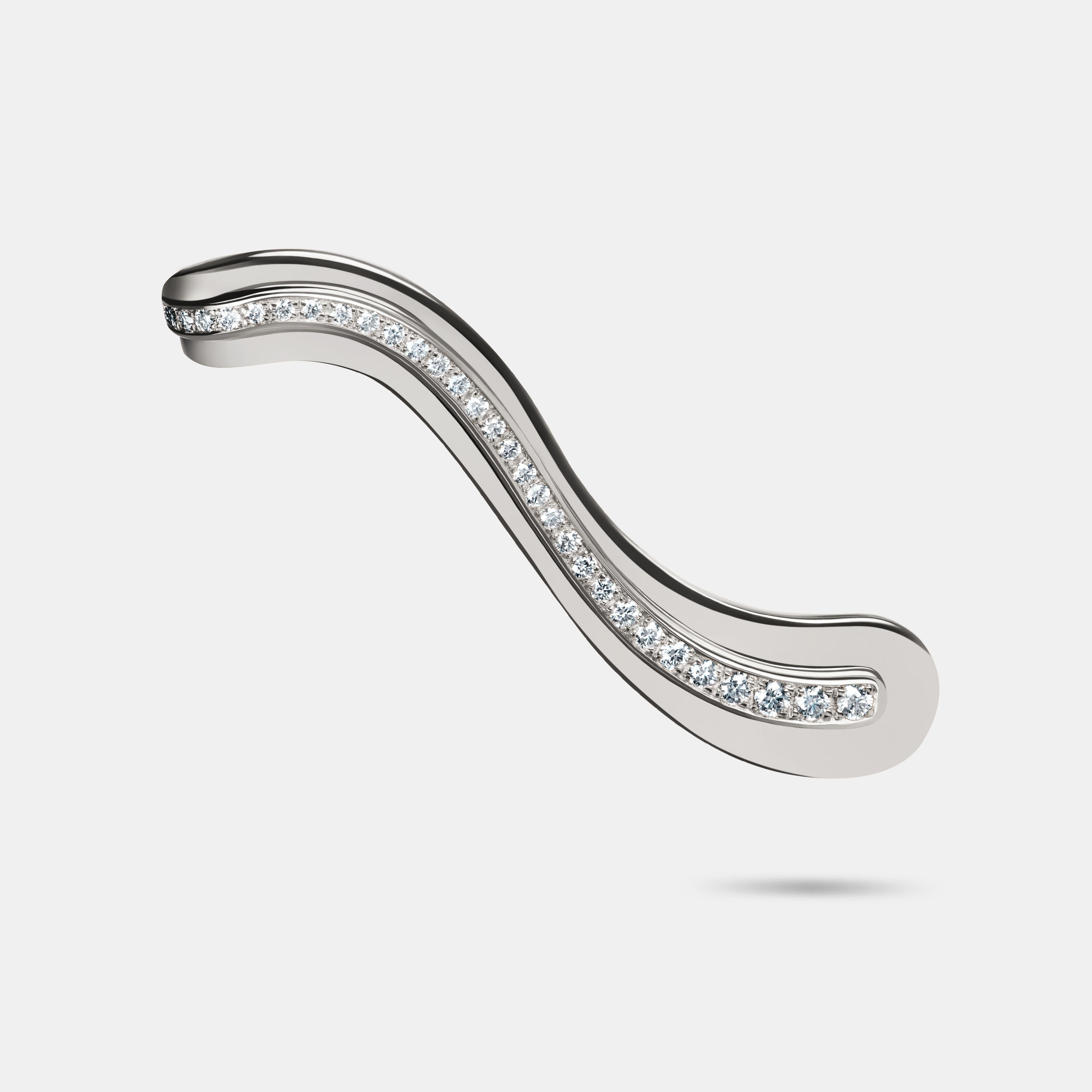 The CONTOURS EAR CLIMBER - DIAMOND crafted in exquisite 18-karat white gold is not a mere accessory. It is a statement piece that follows the natural contour of the ear, creating a harmonious connection with the wearer. Its form is a testament to the beauty of simplicity and the elegance of natural lines. Set with a single row of grain set Round Brilliant Cut diamonds (approx. 0.145ctw.)