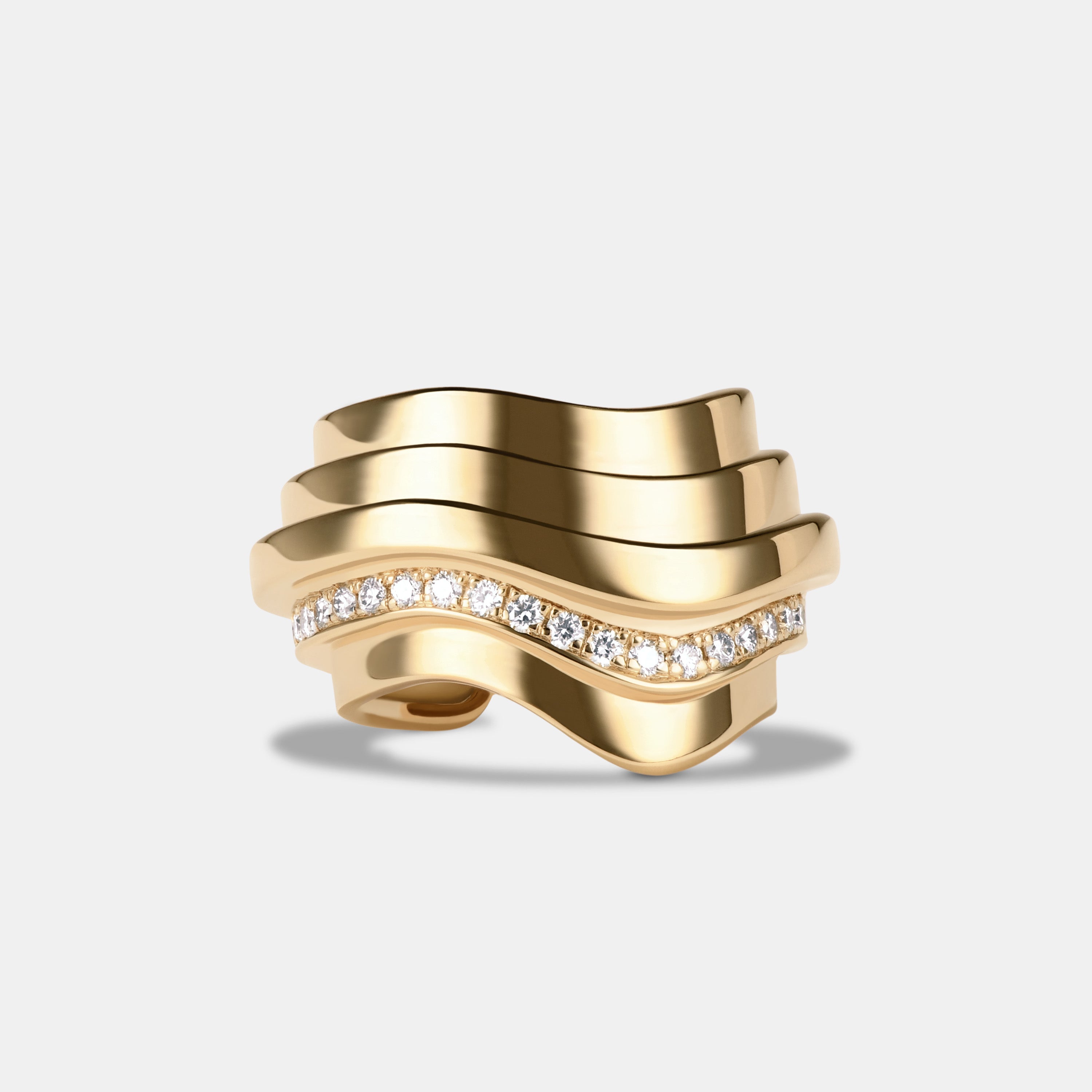 The CONTOURS EAR CUFF DIAMOND is meticulously designed to wrap around the form of the ear, conforming to its shape, and adding an element of elegance and sophistication. Its distinctive design creates depth and dimension through the undulating topography of the 18-karat gold. Set with a single row of grain set natural Round Brilliant Cut diamonds (approx. 0.155ctw.) Please note: No piercing required.