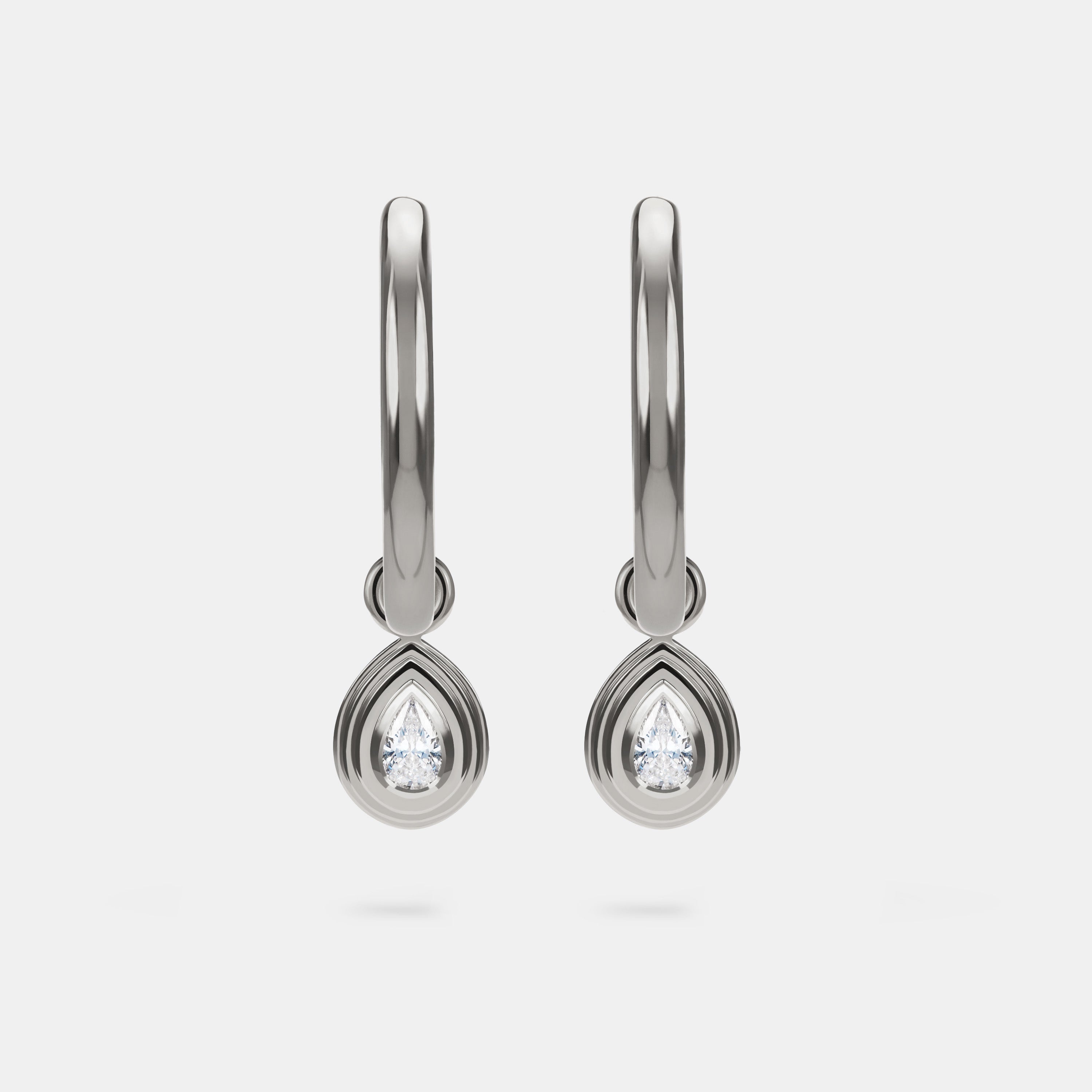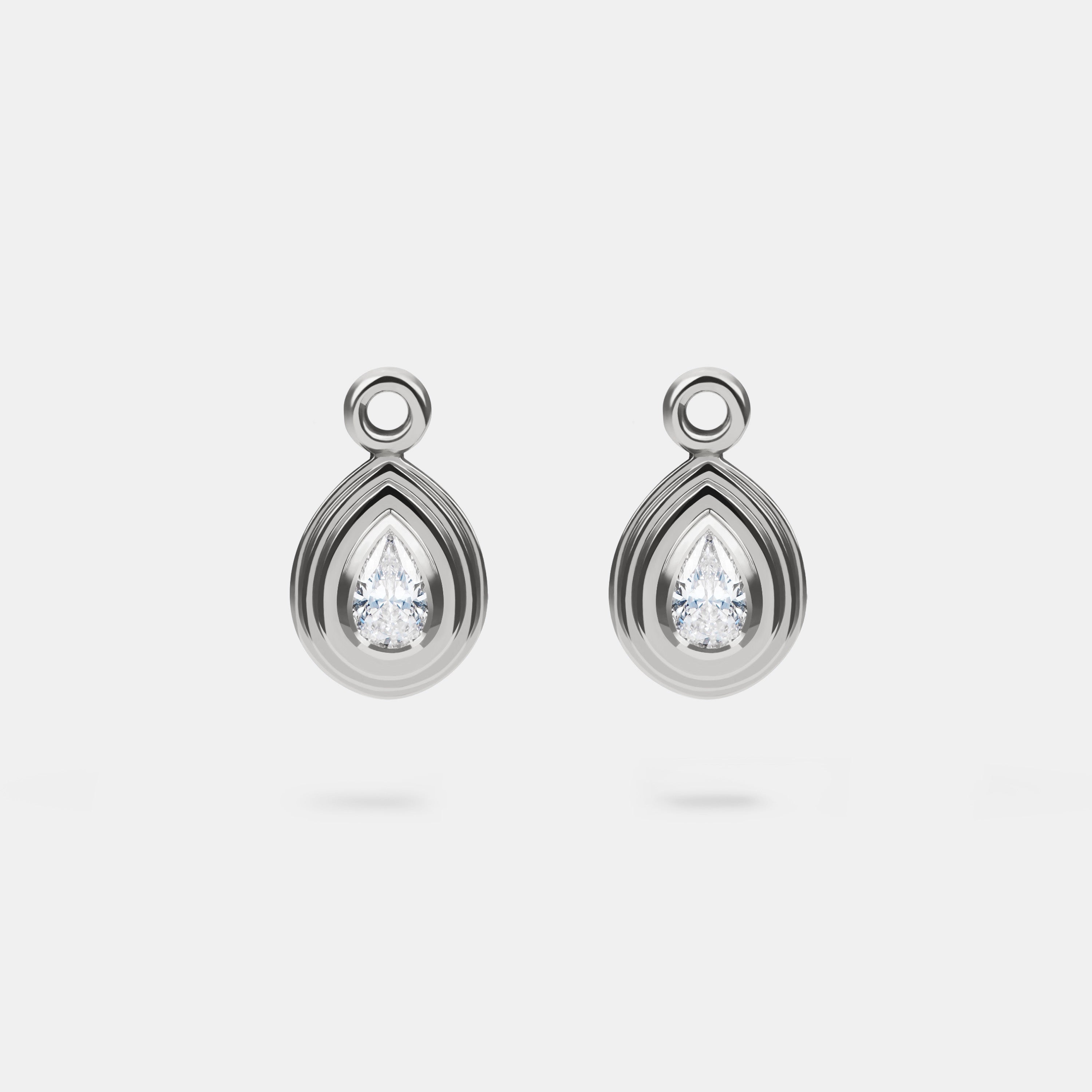 The CONTOURS EARRING CHARMS - PEAR DIAMOND are a versatile and striking piece. Their bezel settings and stepped profile echoes the form of the diamonds they hold. The charms are crafted from 18-karat white gold and feature two natural Pear Brilliant Cut diamonds, approximately 0.46 carat total weight.