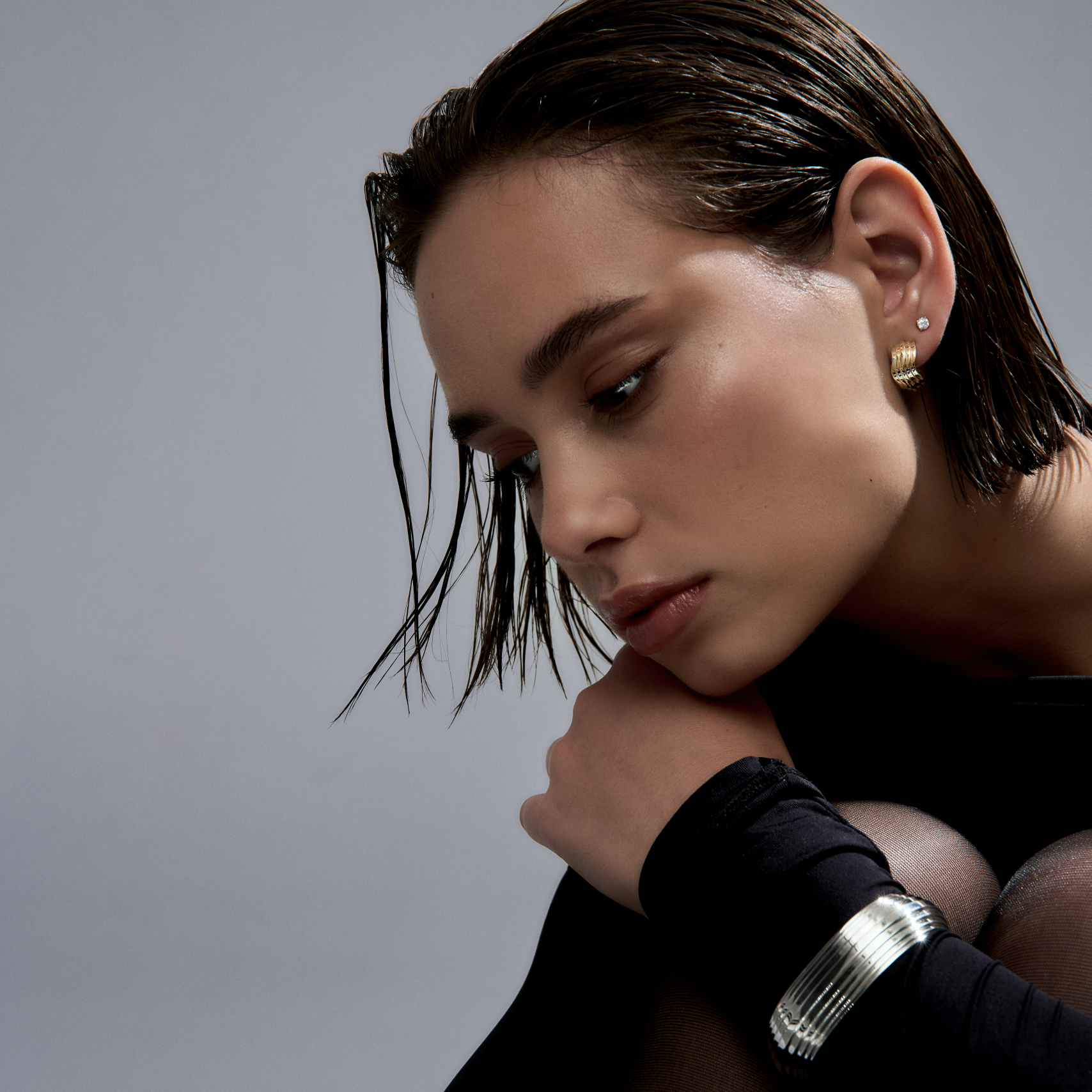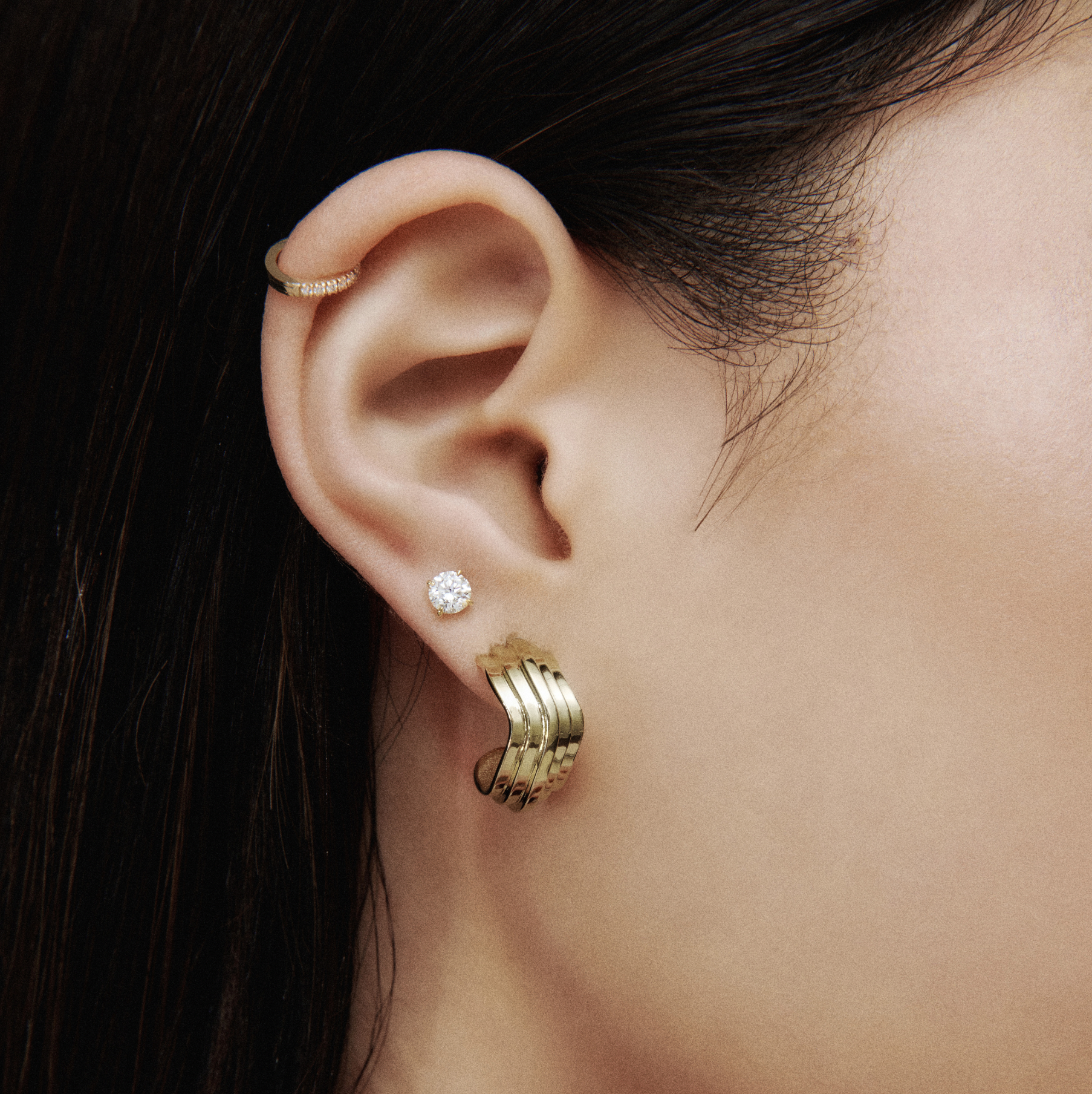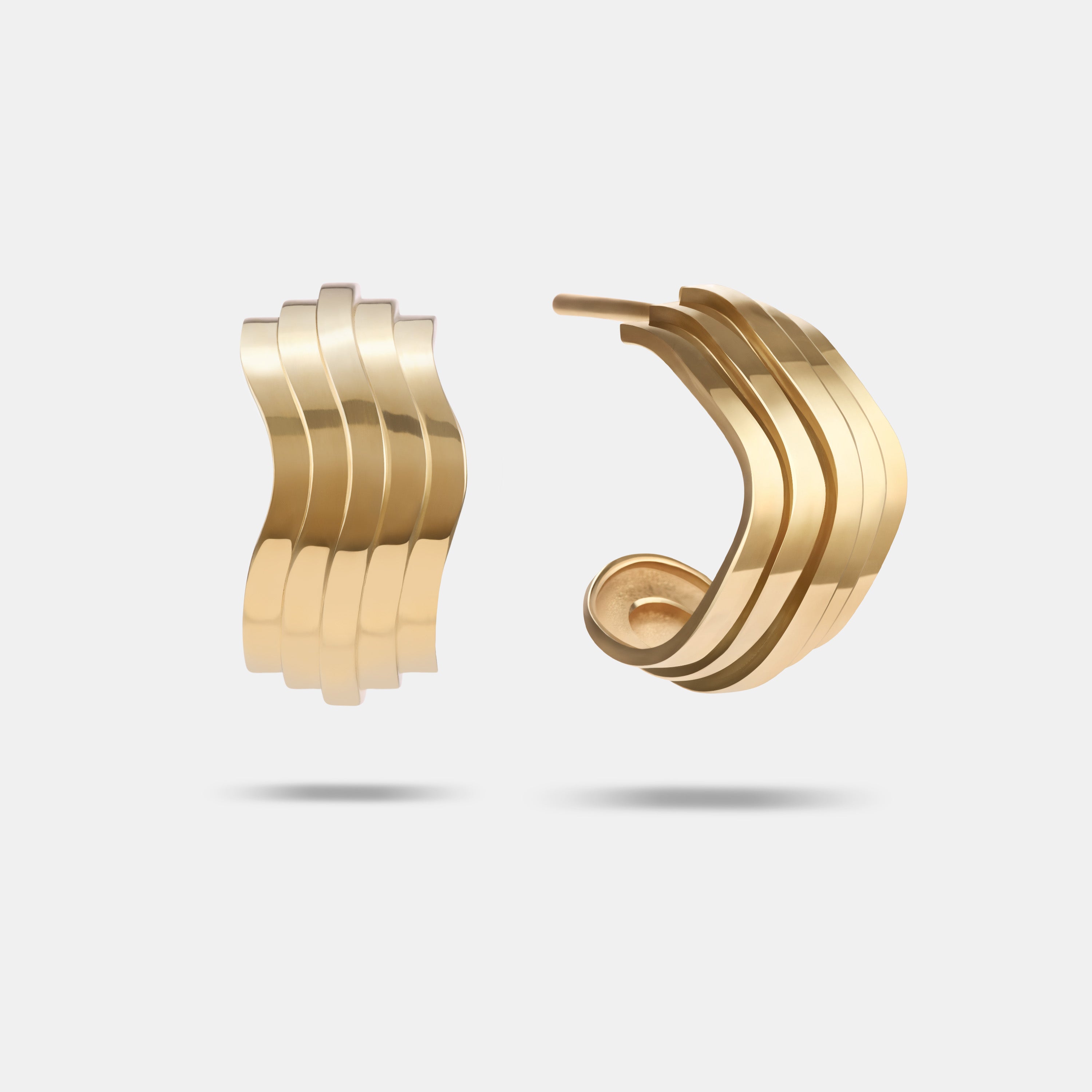 The subtle curves of the CONTOURS HOOPS harmonise with the body as they hang from the ear. Graduating gold steps create a flowing topographic landscape. The result is a pair of earrings that don't just adorn the body, but also complement and enhance the wearer's features in a sophisticated and subtle manner. Available in 9 karat or 18 karat yellow gold.