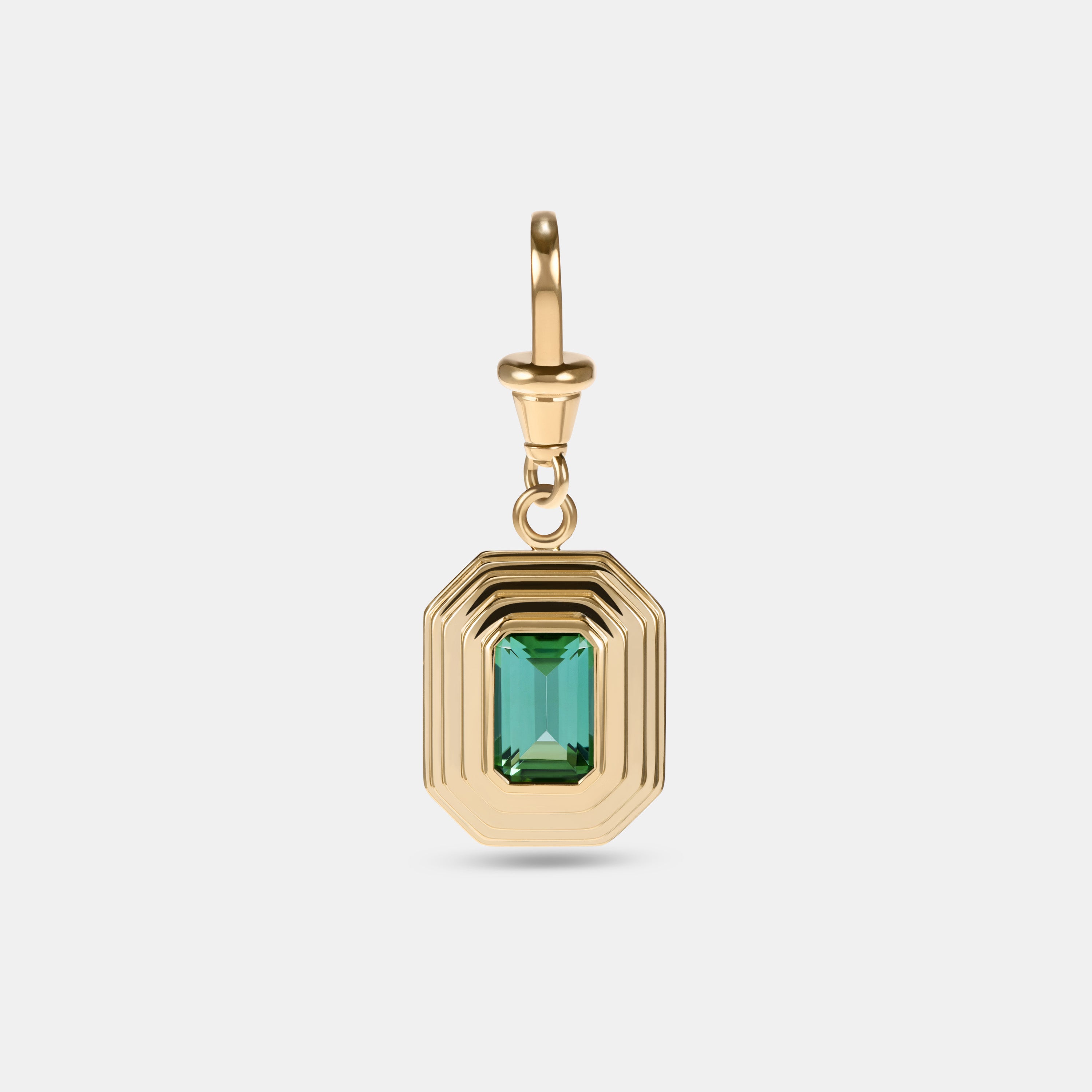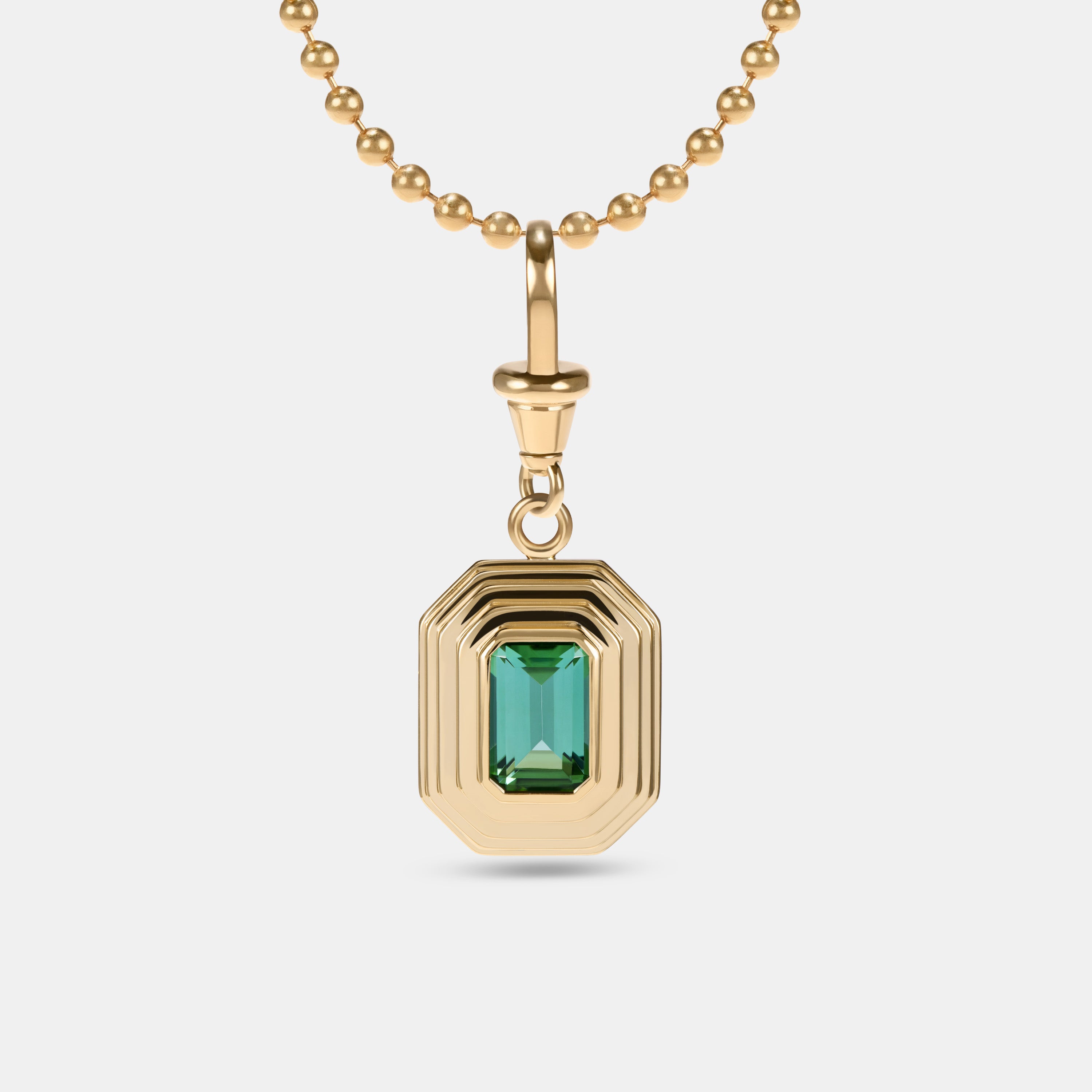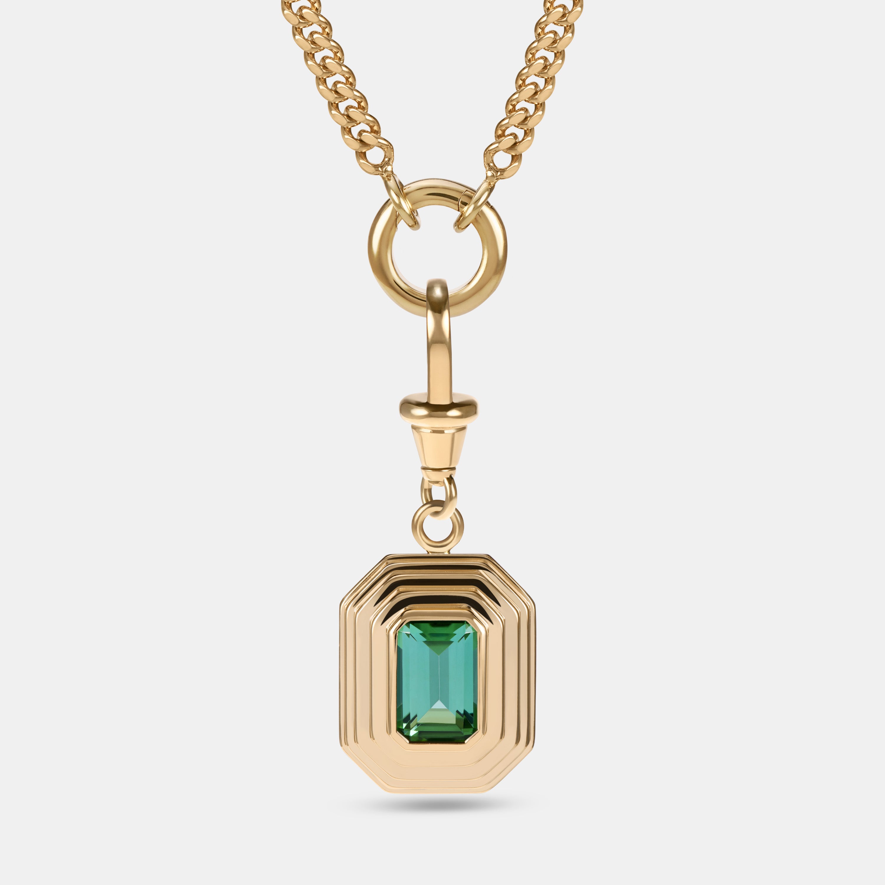 Our CONTOURS PENDANT, meticulously bezel-set with an exquisite 2.00ct Emerald Cut Tourmaline, represents not only a timeless piece of jewellery, but also a truly one-of-a-kind treasure that you won't find anywhere else. The ratio of graduating steps, which echo the form of the centre stone, create a curved profile from the side view, juxtaposing the idea of rigidity and fluidity. Making this pendant even more versatile is its ability to be attached to a chain necklace of your preference, allowing you to mix and match for different occasions.