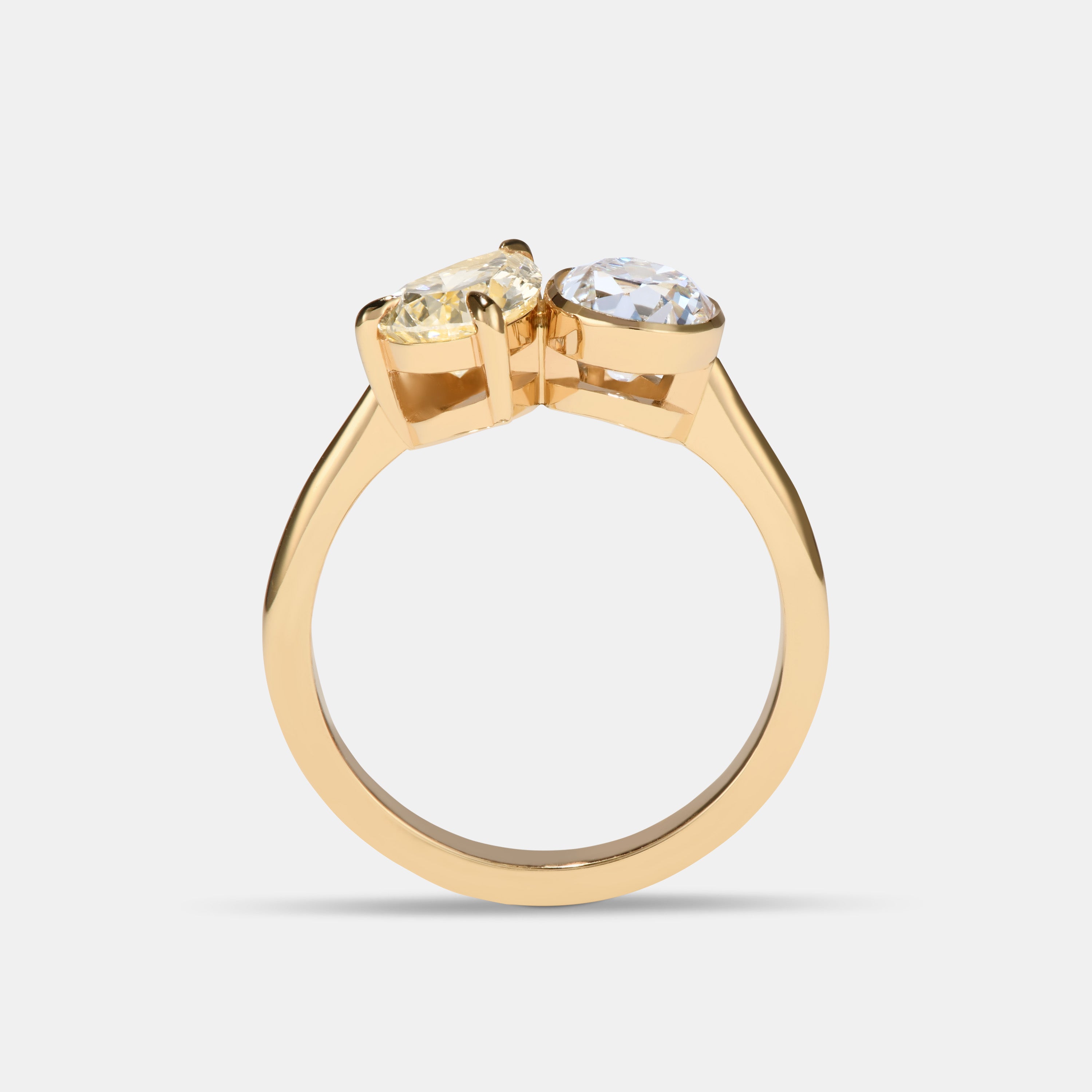 DANI our “Toi et Moi” or “You and Me” two stone design featuring contrasting diamonds in juxtaposed settings on a tapered gold band. Our collection Dani features a claw set modern champagne pear cut diamond representing the future, and a bezel set antique Old Mine Cut diamond representing the past.