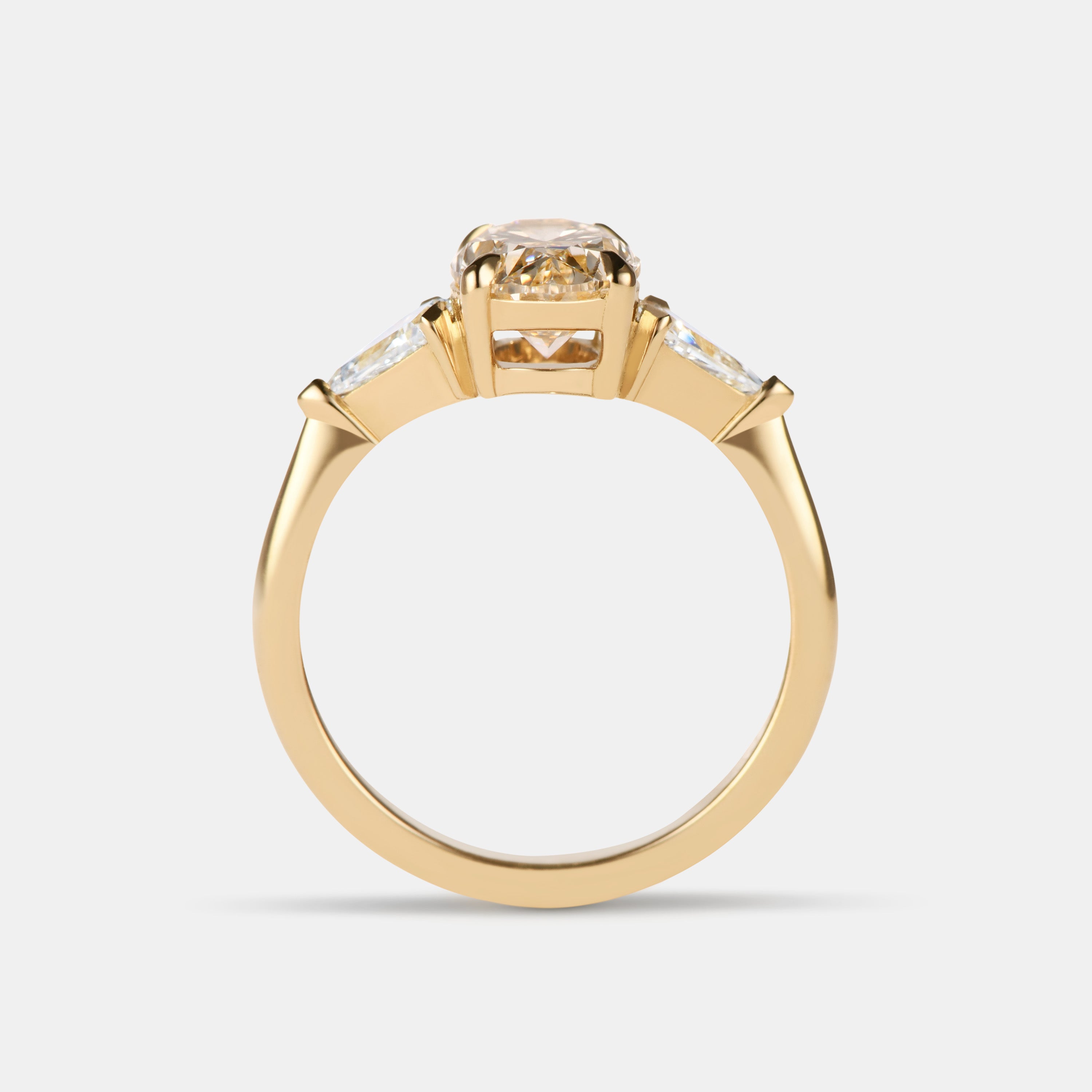 DELILAH is a modern classic with an edge. From the centre stone the kite shaped diamonds angle down in a sharp line to the band where the point perfectly slots into a v-shaped claw. A truly beautiful three stone engagement ring.