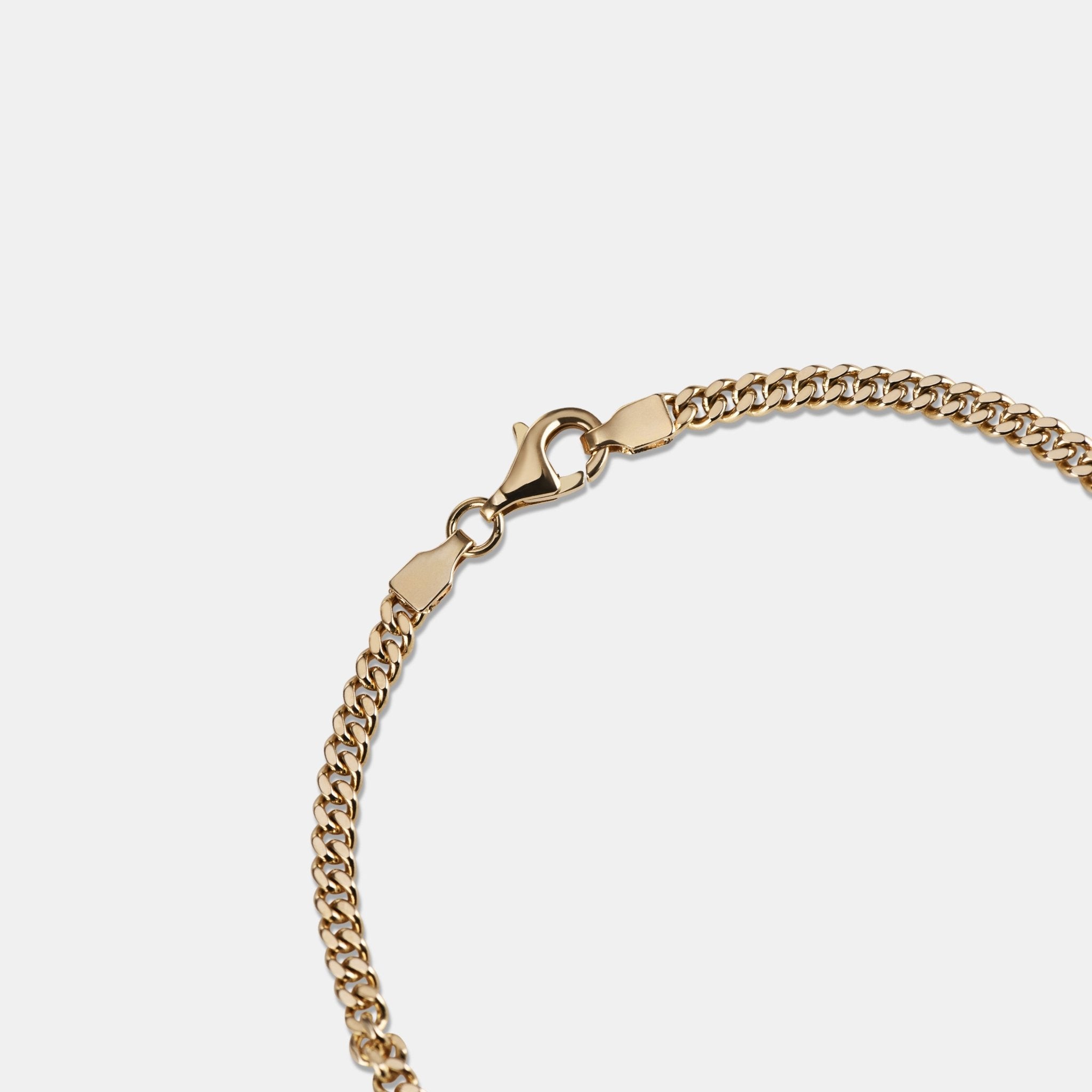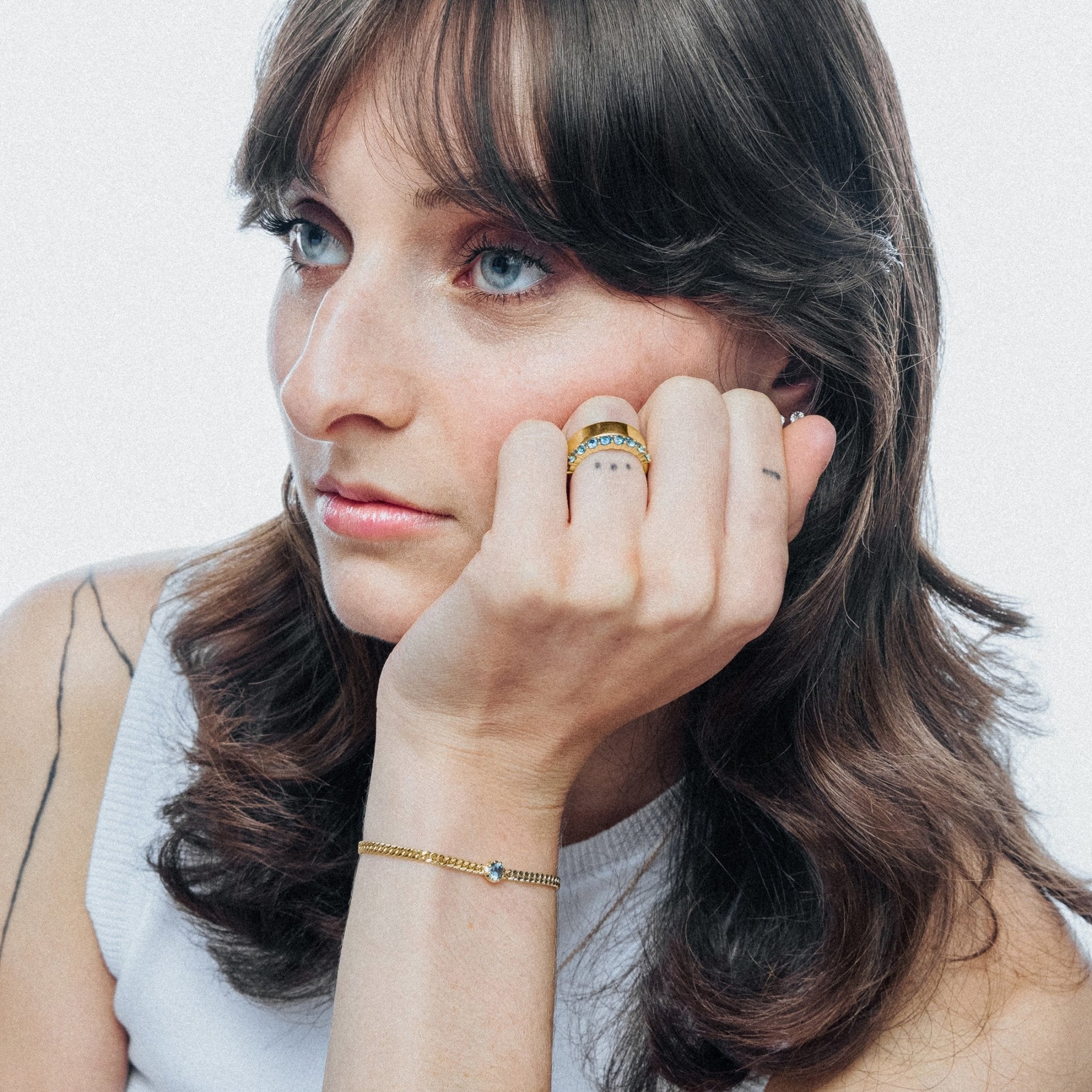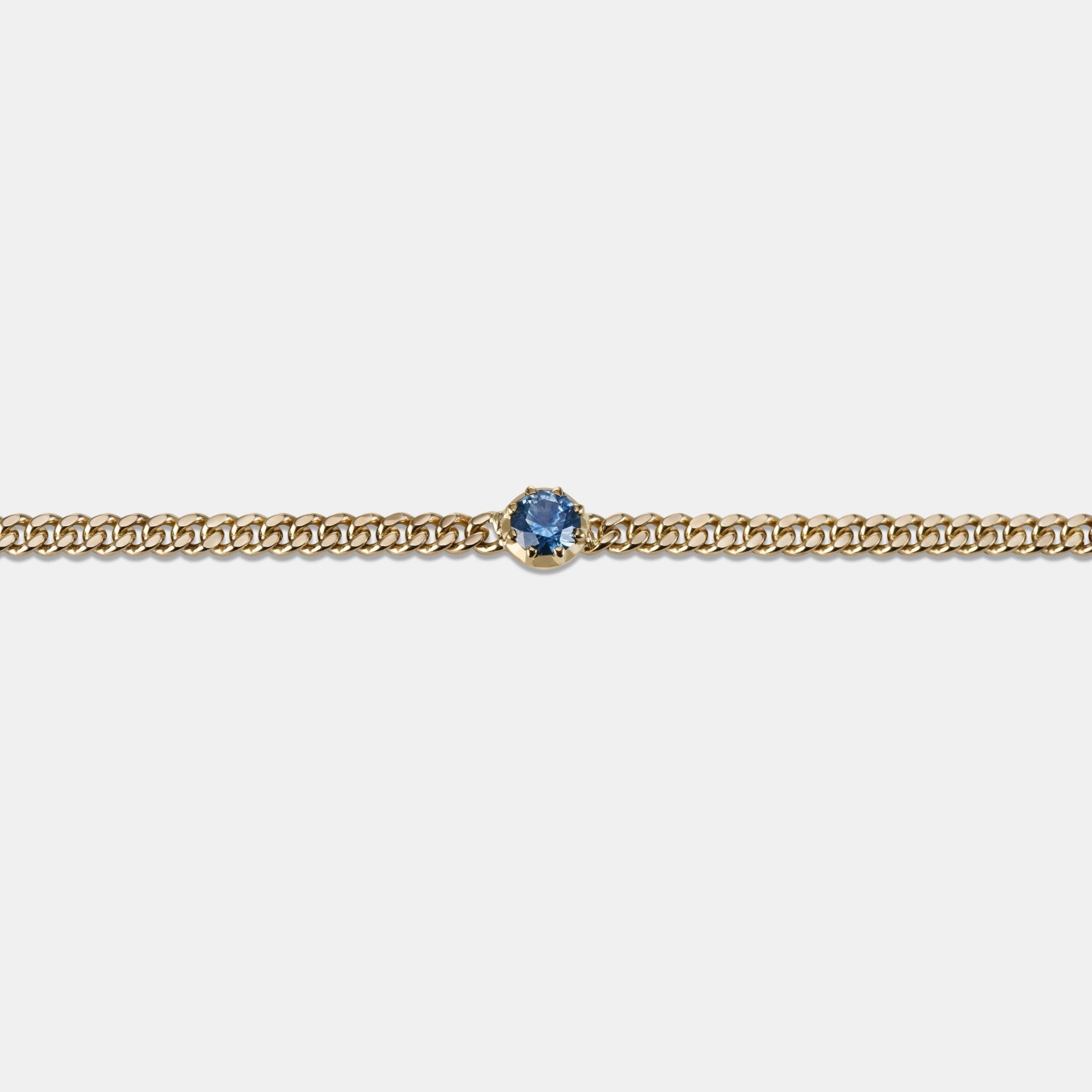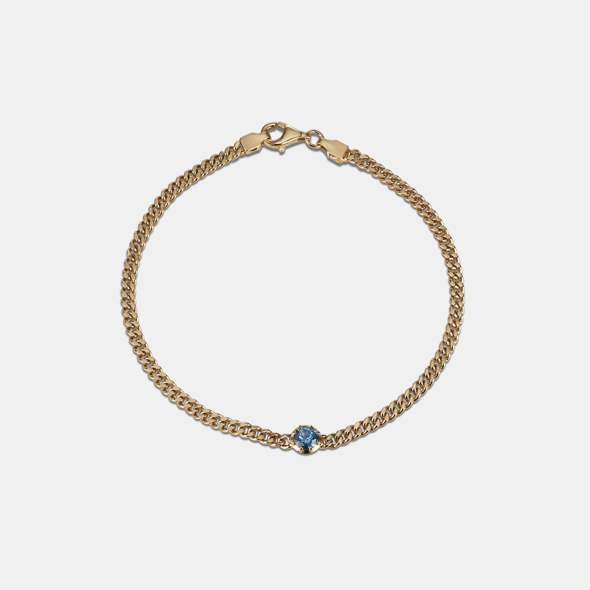 The GEORGIA CURB BRACELET SAPPHIRE made in 14 karat yellow gold with a 0.42 carat teal Montana Sapphire. Its simple design brings out the beauty of the Montana Sapphire, adding a touch of elegance to any outfit.
