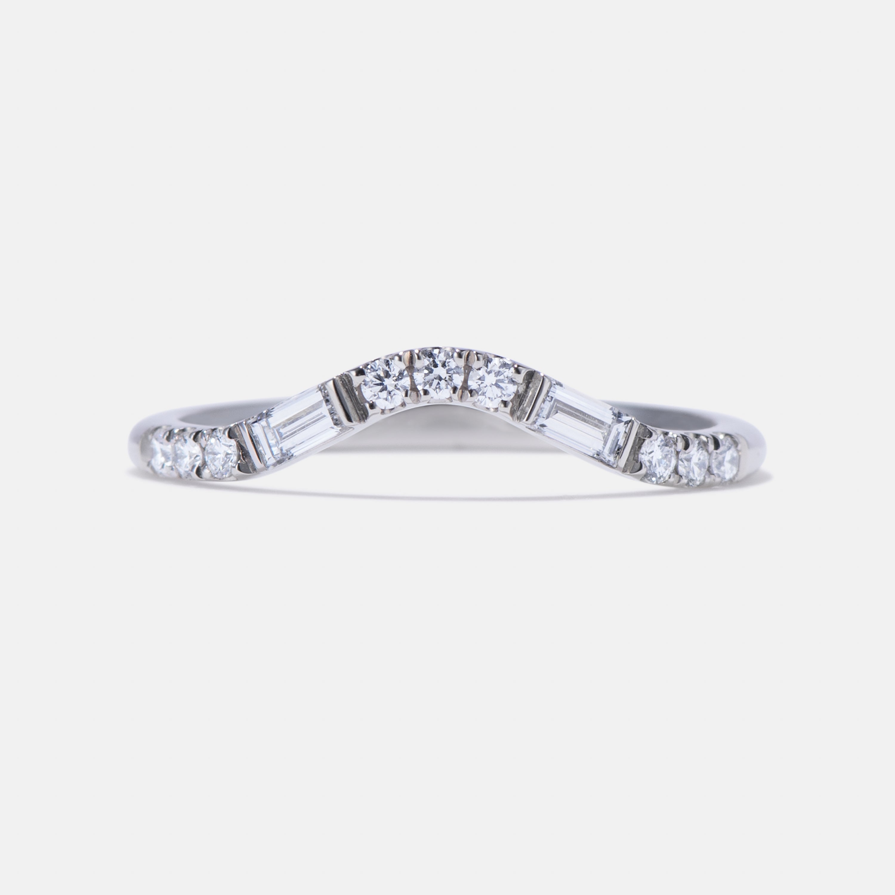 The LANI wedding ring is handmade in platinum, micro claw set with two straight baguette diamonds and round brilliant white diamonds. This sophisticated design will make you stand out on your special day. Timeless and radiant, the LANI wedding ring is a unique piece of art to cherish for a lifetime.