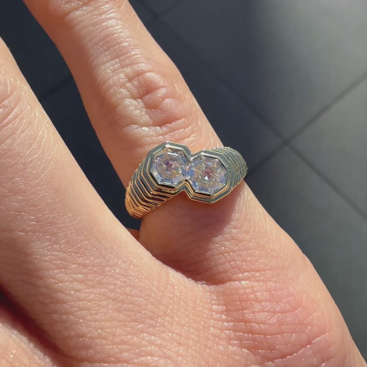 A contemporary duo diamond ring with a pair of octagon step-cut natural diamonds (1.06ctw total, GH colour, VS clarity), set in 18 karat yellow gold.